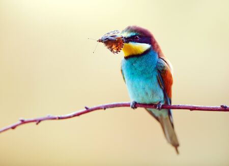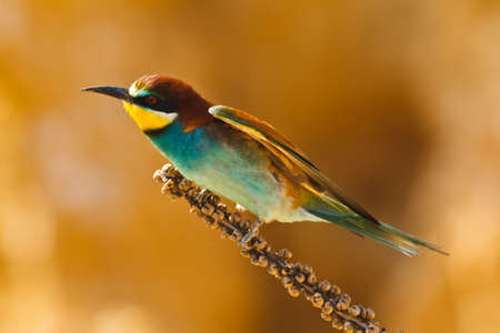 Beauty of birds, portrait of Golden bee eater Merops apiaster sitting on a branch