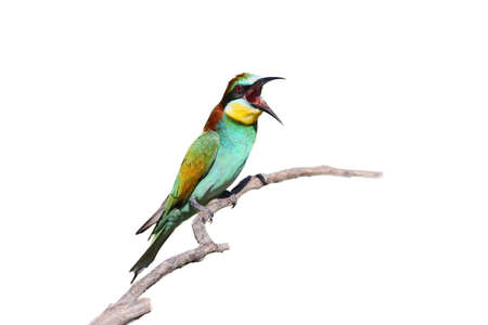 European bee eater with wide open beak sits on the branch isolated on white background