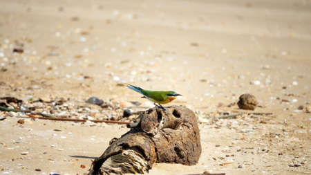 Blue-tailed Bee-eater (Merops philippinus) sits on a beautiful root, bird on the Indian ocean coast waiting for insects to be over sea. Sri Lanka