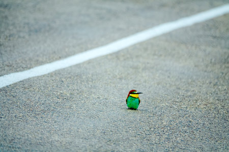 European bee eater (Merops apiaster) are sitting on an asphalt road because it is warm and collect insects