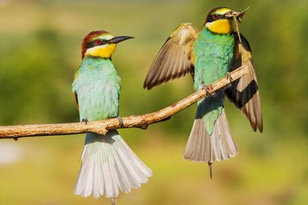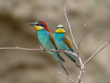 Beautiful colorful enamoured couple of bee-eaters sitting on a twig, Merops apiaster, Dobrogea, Romania