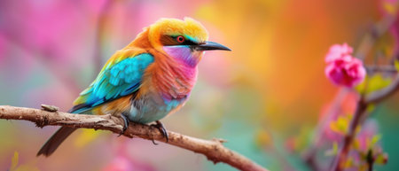 A vibrant bird with multicolored feathers rests on a branch amid soft pink flowers. The setting captures a moment of tranquility in nature, showcasing rich hues.