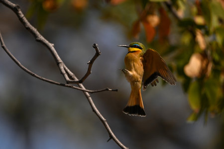 Little bee-eater flies away from bare twig