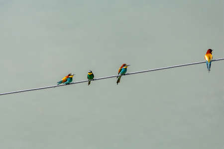 Group of bee-eaters on a wire in the blue sky