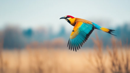 A colorful bird soaring above a field, captured in sharp focus, with a blurred natural landscape in the background.