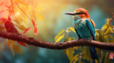 A colorful bird perched on a branch with leaves in the background, AI
