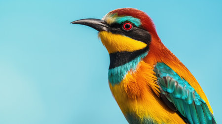 Close-up of a vibrant, colorful bee-eater bird against clear blue background.