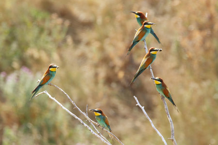 Group of colorful bee-eater on tree branch, against of yellow flowers background