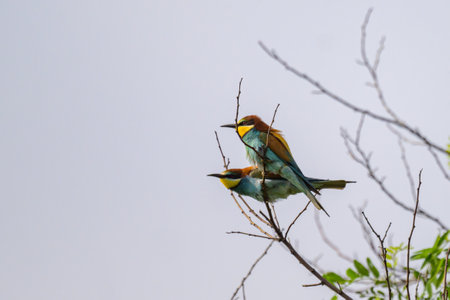 Beautiful colorful enamoured couple of bee-eaters sitting on a twig, Merops apiaster, Dobrogea, Romania