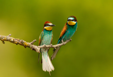 Two European bee-eaters perched on a branch are showing their colorful plumage