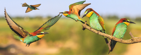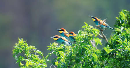 Four beautifully colored characters on a blurred background. Chestnut-headed Bee-eater