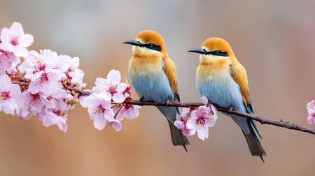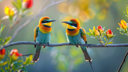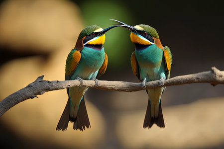 two bee-eaters sitting on a branch on a beautiful background