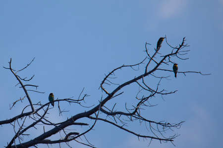 three birds bee-eater on a dry tree against a blue sky