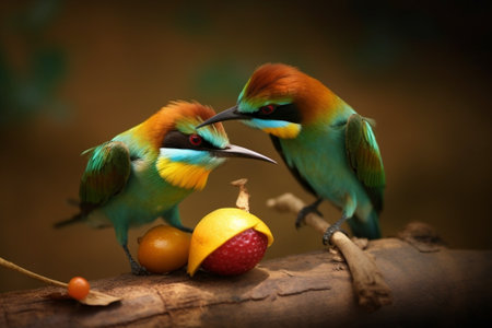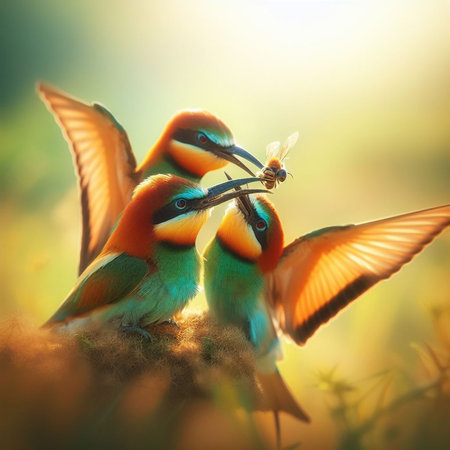 beautiful colorful birds with insects in their beak