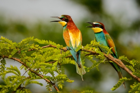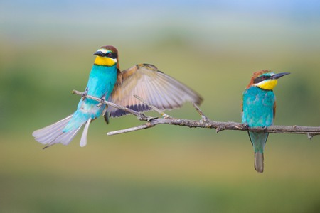 European bee-eater couple on a branch, Merops apiaster. Shallow depth of field and bakground blurred