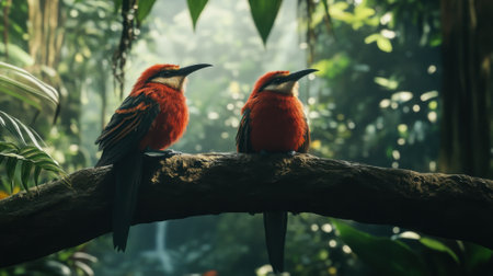 Two birds perched on a branch in the jungle, one with red feathers and another with black, AI