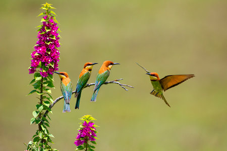 Group of bee-eaters sitting on a branch with pink flowers