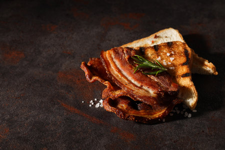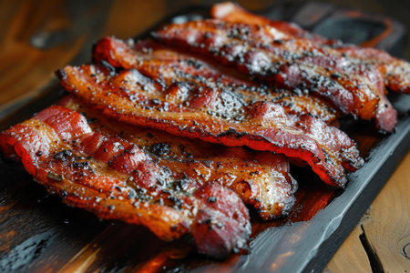 Close up shot of crispy bacon strips on a black surface. Perfect for breakfast, lunch, or snack.