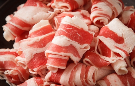 Japanese hot pot belly pork slices on a white plate, with a grey background and clear copy space for food photography.