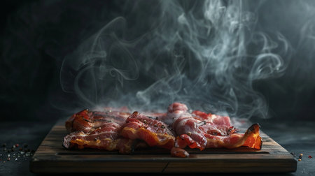 bacon in an unglazed wood bowl, cross-processed and presented with multi-layered figures. this 32k uhd image showcases the darktable processing technique, featuring rectangular fields and a smokey background. a captivating associated press photo capturing the essence of this delicious dish. ai generated