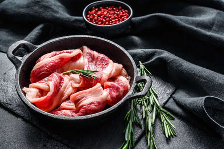 Raw bacon, strips of marbled meat in a pan. Black background. Top view.