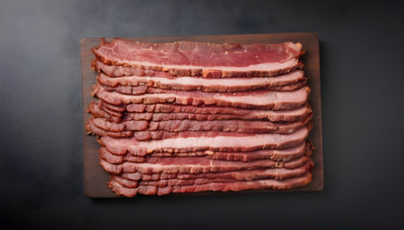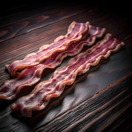 A close-up view of fresh bacon strips presenting vibrant colors and textures. Ideal for culinary visuals, food blogs, and marketing in the gastronomy sector.