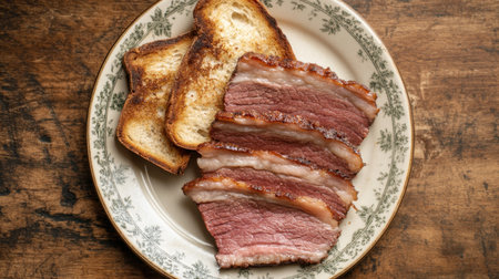 Brisket slices arranged on a plate alongside crispy toast, perfect BBQ meal presentation, appetizing smoked meat