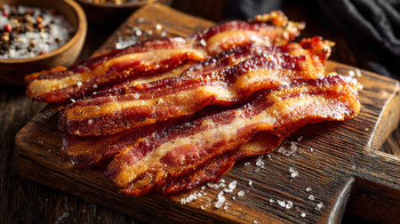Savor the enticing sight of crispy bacon strips arranged on a rustic wooden board, complemented by a variety of seasonings and spices. Perfect for breakfast or a gourmet snack.