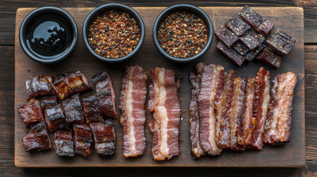 A visually appetizing display of crispy bacon strips and succulent burnt ends, complemented by various flavorful seasonings on a rustic wooden board.