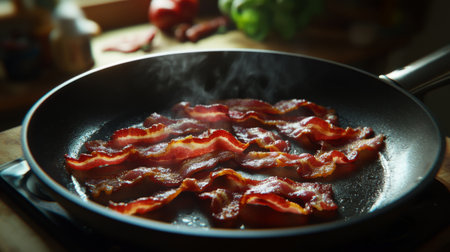 Close-up of crispy bacon sizzling in a skillet, releasing smoke and aroma. Perfect for food lovers seeking breakfast inspiration or cooking ideas.