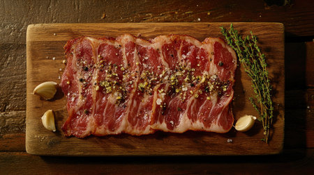 AI Generated. slices of bacon and thyme on a wooden board seen from above