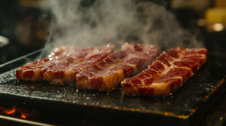 Sizzling bacon strips on a grill create an appetizing scene with steam rising in the air. Perfect for conveying delicious breakfast options or culinary delights.