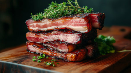 A mouthwatering close-up of juicy smoked pork belly stacked high and garnished with fresh thyme, showcasing rich flavors and textures perfect for culinary presentation.