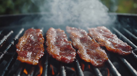 Freshly grilled bacon strips sizzling on a barbecue grill, releasing tantalizing smoke and showcasing a crispy, delicious texture perfect for any meal.