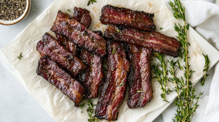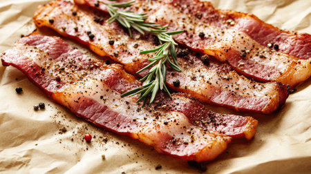 Succulent bacon strips seasoned with robust spices and garnished with fresh rosemary on brown parchment paper, perfect for any meal or snack.