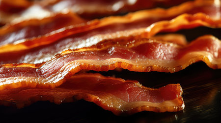 Close-up of crispy bacon strips showcasing their rich color and texture, perfect for breakfast or as a savory snack, evoking indulgence and flavor.
