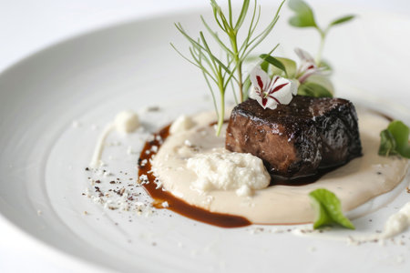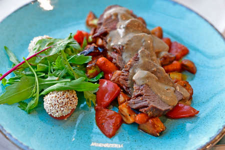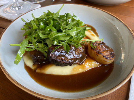 Braised Veal Cheeks with Puree Sauce and Salad served in Fine Dining Restaurant. Ready to Serve and Eat.