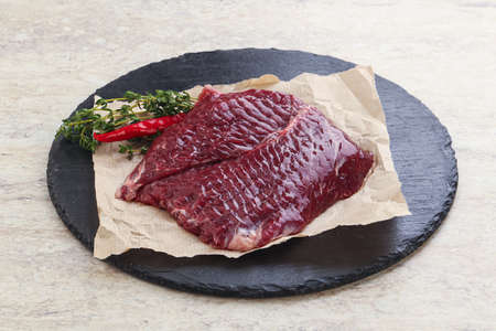 Delicious raw thick skirt steak, in the wooden board. Argentine court very consumed in barbecues