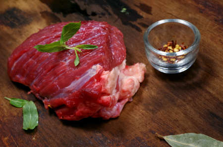 Fresh beef ossobuco steak with salt, spices and herbs on textured concrete background