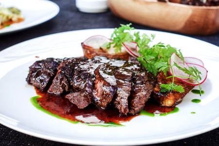 Exquisite serving white restaurent plate of grilled prime beef with tomatoes, spices and herbs topview. Restaurant main course with Well-done delicious veal meat, gourmet grillsteak isolated