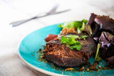 Fresh Beef steaks decorated with vegetables and herbs on a white plate,Selective focus.