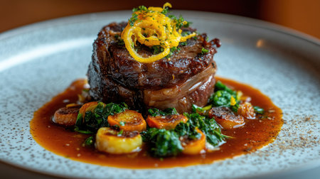 A close-up view of ossobuco alla milanese showcasing tender meat, rich sauce, and vibrant vegetables, perfect for food photography or Italian cuisine.