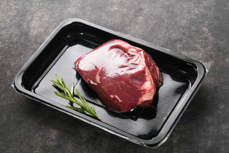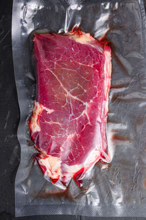 beef steak. Fresh raw beef steak with fork and rosemary in vacuum black plastic pack on black stone background. Vacom package. top view. Mockup for design idea.