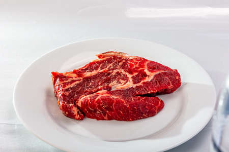 Angus Fatty Beef Slices Raw Meat White Plate Black Background Commercial Photography