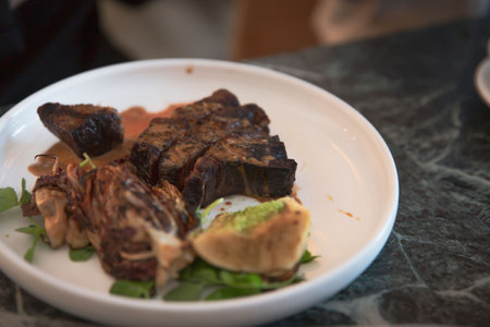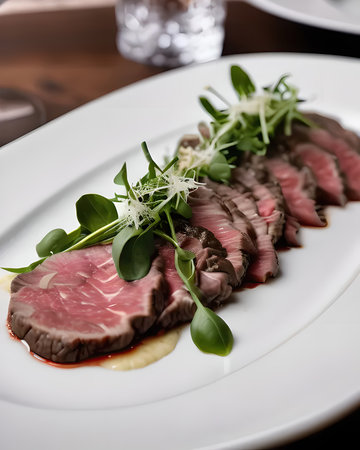Realistic steak warm lighting high detail cozy atmosphere no guests extreme closeup in a restaurant with a neutral color palette. Generative AI Generated