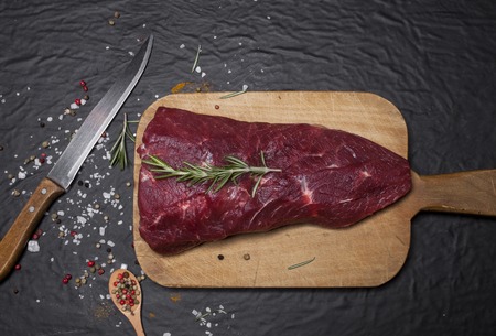 Raw meat. Raw beef steak on a cutting board with rosemary and spices.