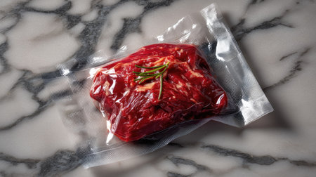 This image showcases a fresh piece of red meat vacuum packed with a sprig of rosemary, resting on an elegant marble surface, ideal for food photography.