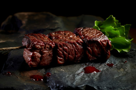 Perfectly grilled meat food composition showing its juicy and delectable texture.