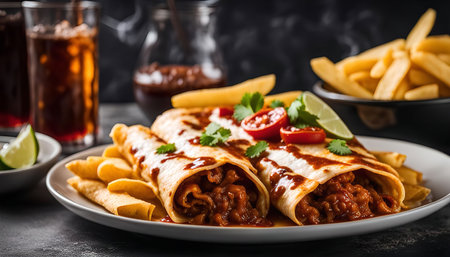 The traditional food of Latino-Americans is encheladas. Pita stuffed with meat and vegetables. On a dark background close up