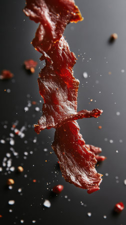 Gourmet beef jerky slice gracefully suspended against a dark background, surrounded by scattered salt crystals and peppercorns, highlighting texture and rich color